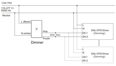 Nota 2: El regulador de intensidad y el controlador/decodificador DALI están conectados de forma independiente a la alimentación de entrada (red de CA).