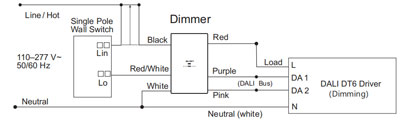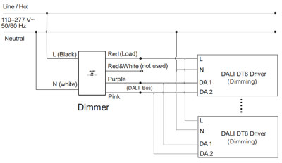 Nota 2: Conecte el cable de entrada de CA activo (L) del controlador DALI al cable de carga del atenuador (rojo).