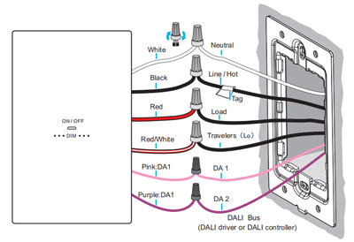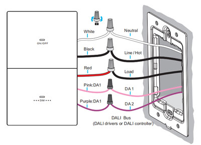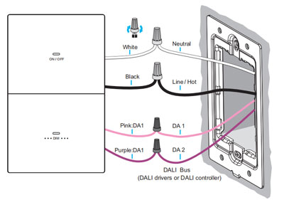 El regulador de intensidad dali-2 con pulsador Con un rango de voltaje de entrada universal de 100-277 V CA, es compatible con las cajas de pared estándar existentes y se instala fácilmente en el marco de montaje. Su diseño de dos botones permite encender y apagar las luces del grupo. Es fácil de usar y no requiere configuración adicional.