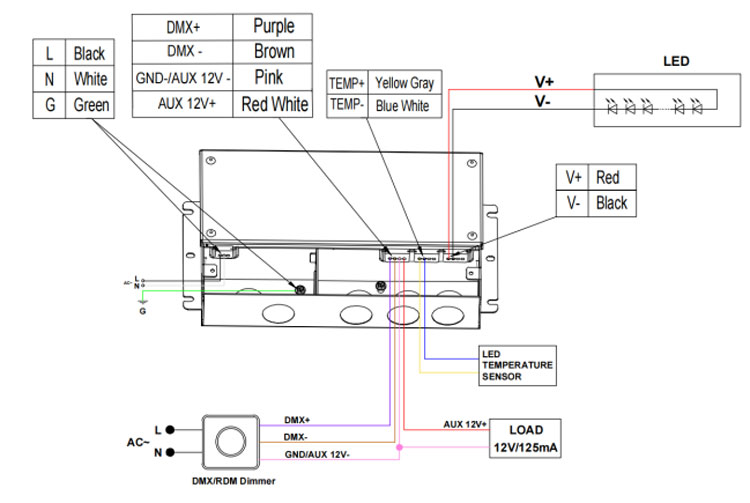 3. El nombre del modelo SMT - California xx0 96 -DMXJ-T significa que no hay fuente de alimentación auxiliar pero hay detección de temperatura de la lámpara, por lo que el controlador LED no tiene cableado de alimentación auxiliar.