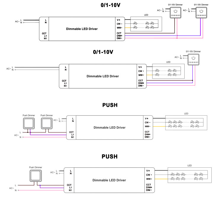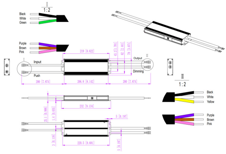 Cable de atenuación de salida: Marrón (CCT) Púrpura (DIM+) Rosa (DIM-) 3*18 AWG |