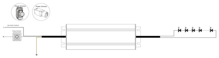 1. La modulación por ancho de pulso (PWM) del voltaje de salida se puede ajustar a través del terminal de entrada de la línea de fase de CA (L) mediante la conexión de un atenuador de fase/Triac o un sistema de iluminación.